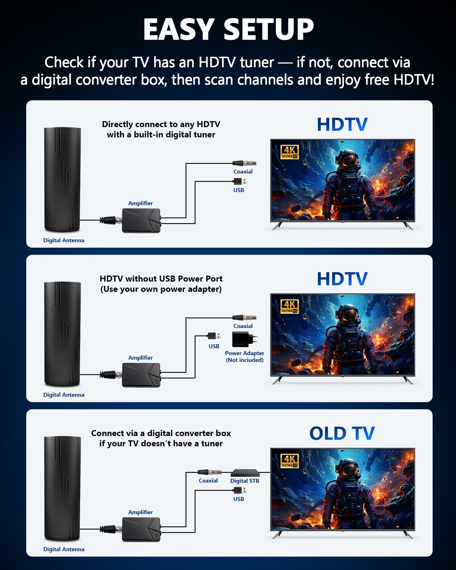 - Quick, Hassle-Free Setup: Forget complicated instructions — just connect it to your TV, place it in the best spot, and scan for channels. In minutes, you’ll have access to a wide variety of free local channels. Whether you’re new to HDTV antennas or a cord-cutting veteran, setup is a breeze!