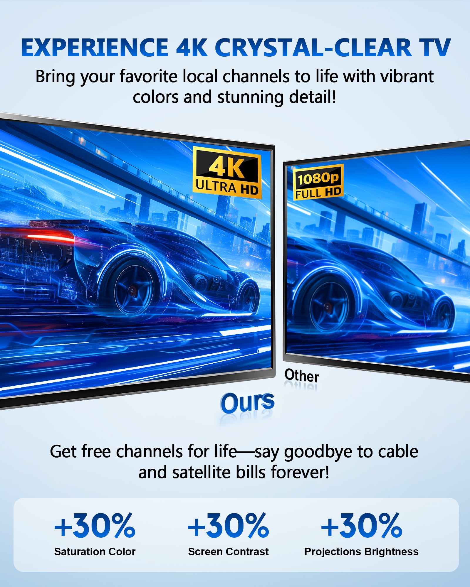 - Long-Range Reception for More Channels: With an amazing 2200+ miles reception range, this antenna reaches distant broadcast towers to give you a wide variety of free channels. From local news to sports and family entertainment, you’ll rarely miss a moment — even if you live far from the city center.