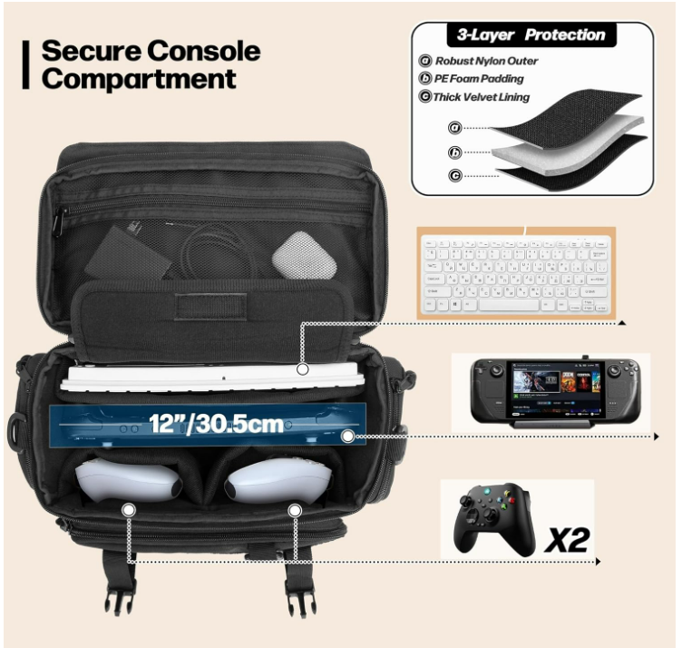 Designed for Compatible with Steam Deck (OLED) / Lenovo Legion Go / Go S / Switch 2, this travel bag also fits PS5 Portal and other gaming devices. Perfect for consoles, docks, AC adapters, controllers, cables, iPads, or keyboards.