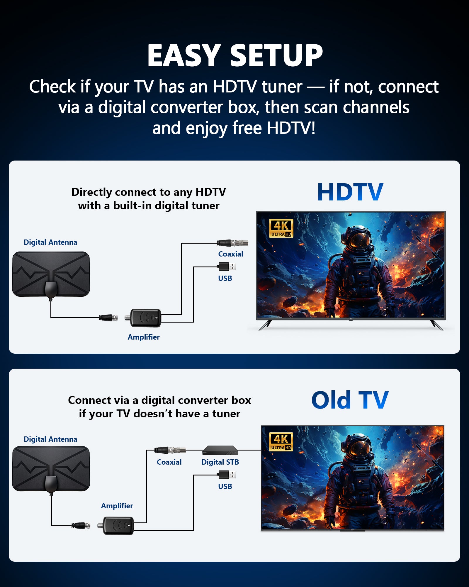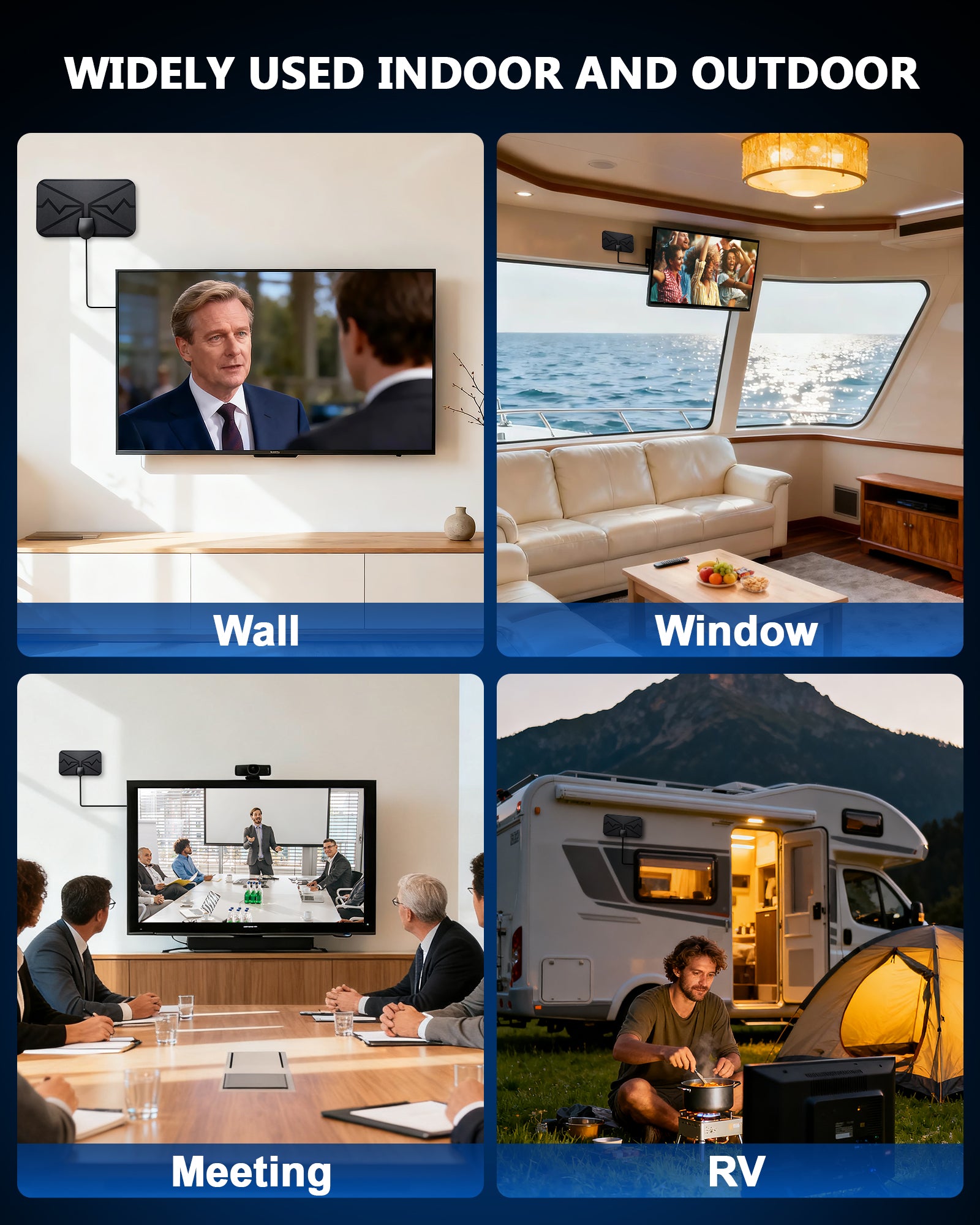 - Built-in Signal Amplifier: Boosts weak signals for longer range and clearer pictures. If you find only a few channels, move the antenna and run a new channel scan — you’ll likely receive more free broadcasts.
